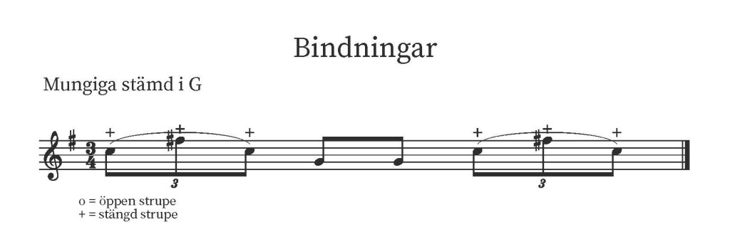 Om man ser till hur svensk folkmusik spelas på fiol märker man att det frekvent används bindningar, där man spelar flera toner på samma stråkdrag. Motsvarande kan spelas på mungiga. Man spelar då flera toner under samma slag/knäpp på mungigans tunga och under samma in- eller utandning. Som en övning kan man göra många fler bindningar i låten för att behärska tekniken. Som omväxling kan man också pröva att göra motsatsen och stycka upp alla toner, så att man växlar mellan in- respektive utandning för varje ton i låten. Om man vill kan man sedan välja hur man förhåller sig till exempelvis en upptecknad låt, eller om man utgår ifrån en version av låten spelad på fiol. Man kan spela likadant som originalet, eller modifiera och anpassa ”stråkföringen” i sitt spel.